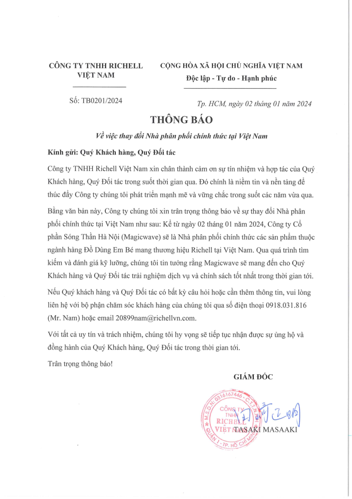 Bằng văn bản này, Công ty chúng tôi xin trân trọng thông báo về sự thay đổi Nhà phân phối chính thức tại Việt Nam như sau: Kể từ ngày 02 tháng 01 năm 2024, Công ty Cổ phần Sóng Thần Hà Nội (Magicwave) sẽ là Nhà phân phối chính thức các sản phẩm thuộc ngành hàng Đồ Dùng Em Bé mang thương hiệu Richell tại Việt Nam. Qua quá trình tìm kiếm và đánh giá kỹ lưỡng, chúng tôi tin tưởng rằng Magicwave sẽ mang đến cho Quý Khách hàng và Quý Đối tác trải nghiệm dịch vụ và chính sách tốt nhất trong thời gian tới.